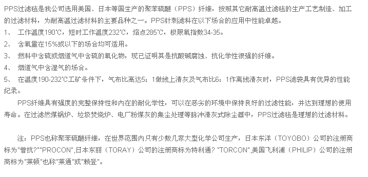 PPS過濾氈是我公司選用美國,日本等國生產的聚苯硫醚(pps)纖維,按照其他高溫過濾氈的生產工藝制造,PPS針刺氈的加工過濾材料,為高溫過濾材料的主要品種之一。